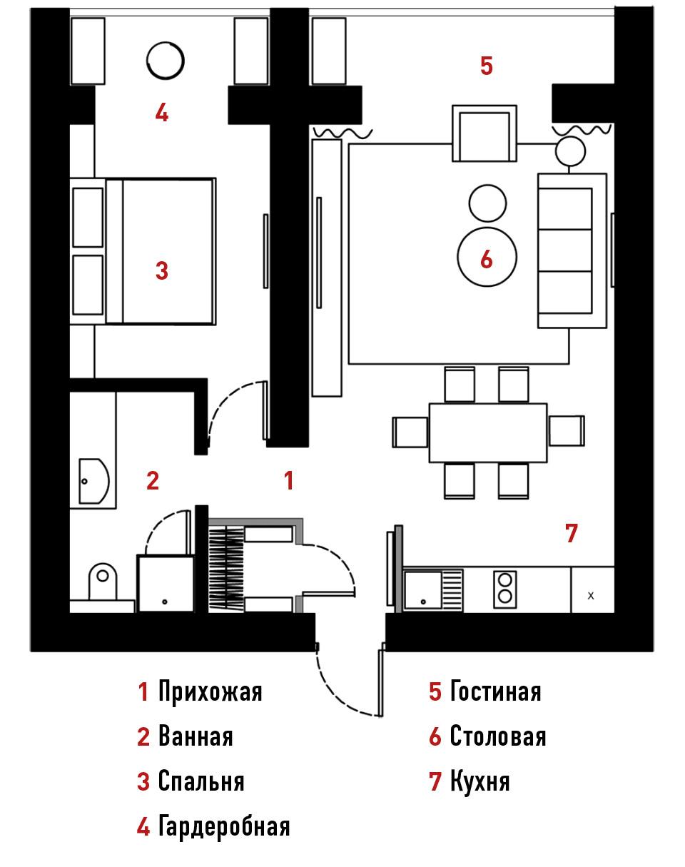 Посреди квартиры имеется несущая стена, так что возможностей для большой перепланировки у Юлии не было. Тем не менее дизайнер смогла превратить однокомнатную квартиру в двухкомнатную, поместив на место кухни спальню (чтобы узкое помещение не выглядело слишком тесным, стена в изголовье целиком зеркальная), а зону готовки перенесла в гостиную. При входе в квартиру появилась гардеробная, стены которой, как и перегородка между прихожей и кухней, сделаны из темного стекла. Такие конструкции, как объясняет дизайнер, занимают меньше места, чем перегородки из гипсокартона. К тому же хозяева не хотели городить в небольшом пространстве лишние глухие стены. Во время ремонта Кирпичева также присоединила к комнатам два балкона. Один превратился в дополнительную гардеробную при спальне, а другой стал частью гостиной.