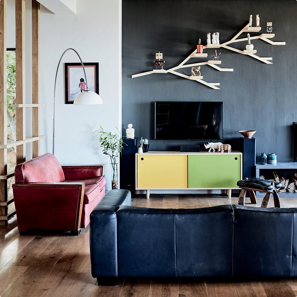 Дом находится недалеко от побережья, а хозяева, которые самостоятельно занимались его оформлением, — большие любители здорового образа жизни на свежем воздухе (не зря в углу притаилась серферская доска). Интерьер у них получился с элементами экостиля, но без фанатизма. С реечным потолком и простыми деревянными ограждениями соседствует винтажный диван богемного вида, а одна из стен покрыта краской цвета антрацит. Подобная контрастная покраска (см. на предыдущем развороте) позволяет создать в комнате зрительный центр, а при необходимости — визуально откорректировать пропорции помещения.