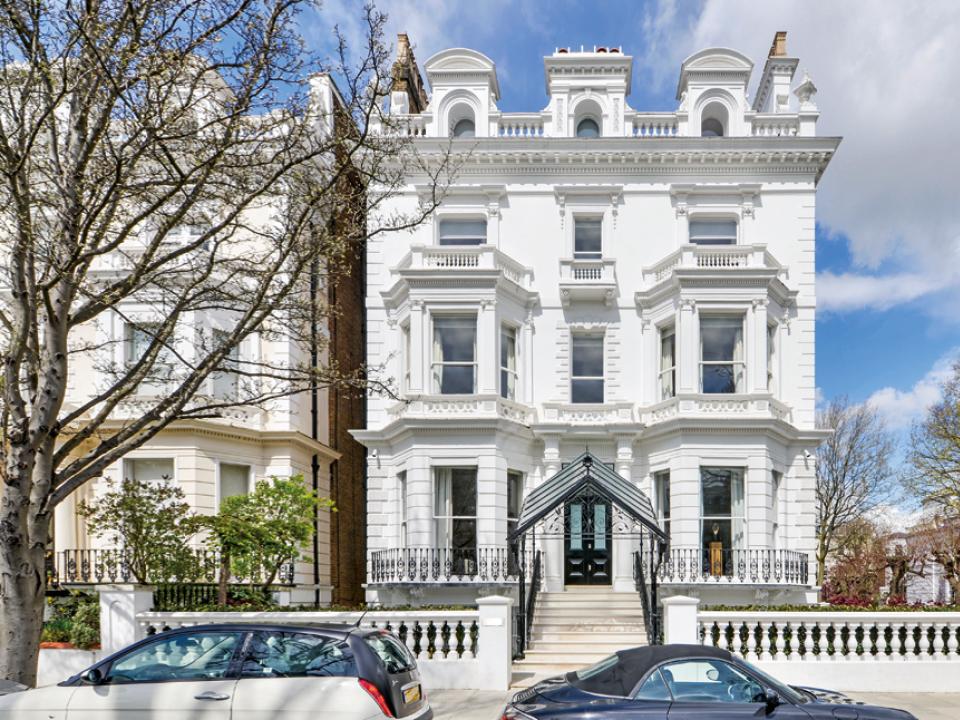 Дом с 8 спальнями и видами на Пембридж‑сквер. На площади 1234 м² есть 4 гостиные, балкон, терраса, подземная парковка, спа с зоной для массажа и тренажерный зал. На втором этаже, рядом с хозяйской спальней, расположены 2 гардеробные и большая ванная. Цена по запросу.
