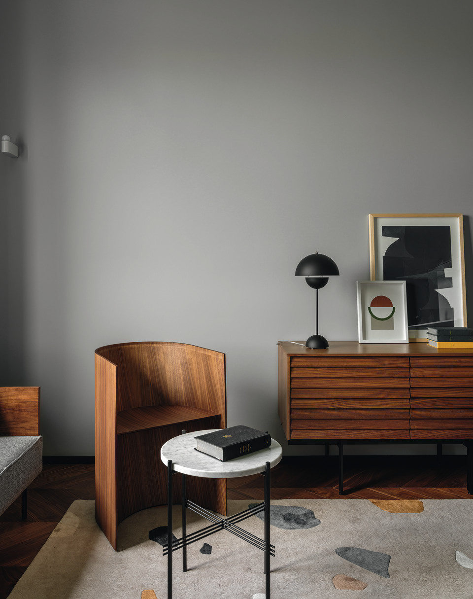 Полине Беляковой и Екатерине Григорьевой достался заказчик мечты — он точно знал, какой ему нужен интерьер, любовался предыдущими работами Suite Home Interiors и прекрасно ориентировался в дизайнерской мебели. Но выбор предметов Полина и Екатерина начали не с конкретного стула или комода, а с их функции — “нужен прямой диван, я планирую на нем лежать с книгой” или “за столом я буду есть один и иногда принимать до пяти гостей”. Дизайнеры уверены, что для небольшой квартиры нужно особенно тщательно выбирать мебель и, главное, рассчитать системы хранения. “Если планировка не продумана, никакие декораторские уловки положение не спасут, — говорят дизайнеры. — Сперва нужно предусмотреть все для хранения, иначе квартира рискует превратиться в один большой склад, что, конечно, расширит пространство, но только для вещей, а не для хозяина”.