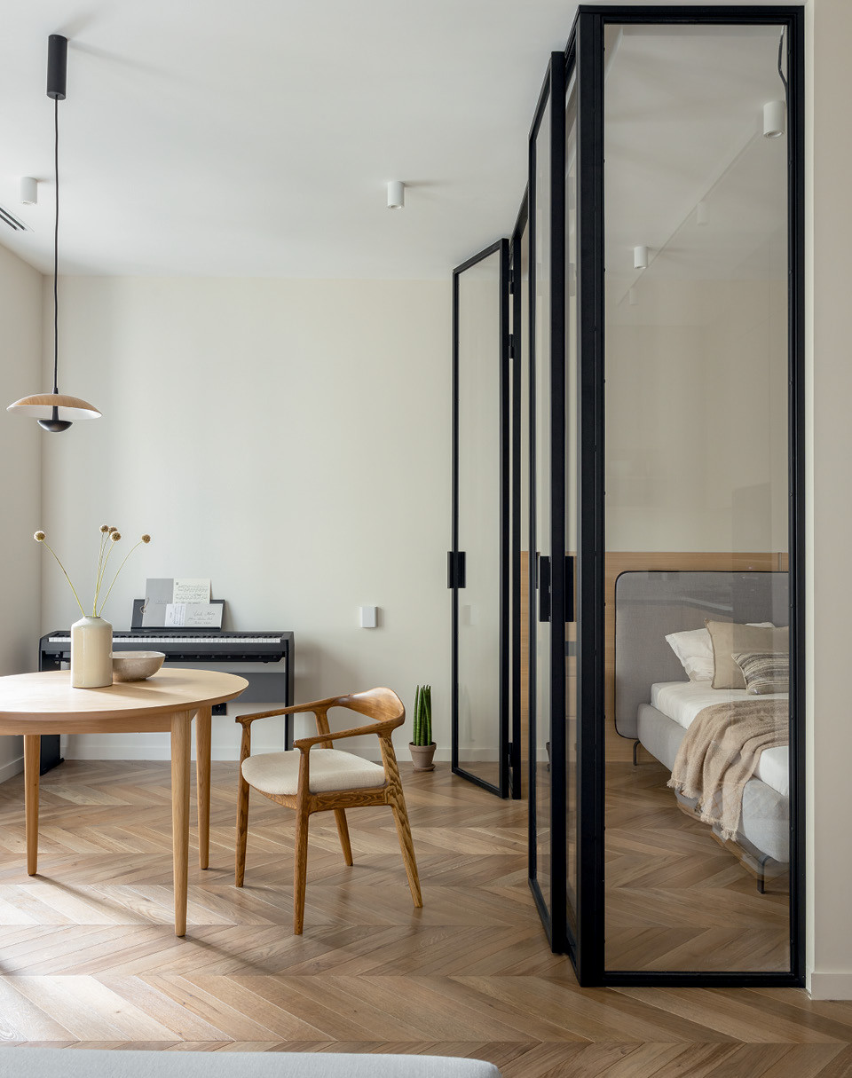 В квартире три окна, и можно было отдать одно под изолированную спальню, но Гуляева предпочла вариант с кроватью в стеклянном кубе. Там же находится вход в большую гардеробную, где хранится не только одежда, но и аксессуары, которые могут пригодиться для съемки. На потолке спальни предусмотрено место для рулонных штор на электроприводе, но Мария живет в квартире уже полгода и до сих пор не повесила их. “Предполагалось, что за ними я смогу уединяться, если у меня гости, но пока такой необходимости не возникало. К тому же мне нравится ощущение легкости и прозрачности”, — говорит она. Кстати, в спальню есть еще один вход из прихожей, чтобы было проще попасть в гардеробную и не обходить все по кругу.