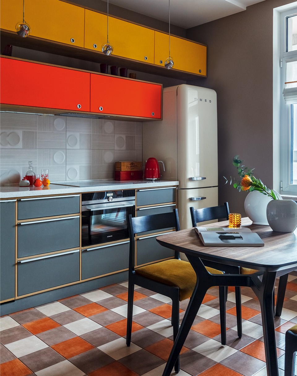 Кухня. На стилистику интерьера повлияли местоположение и комплект мебели, купленный хозяином. Квартира находится в жилом комплексе “Наследие”, архитектура которого немного напоминает сталинские высотки, а спальный гарнитур похож на мебель середины XX века. Так предметы в стиле американских 1960‑х встретились здесь с элементами советского прошлого. “Этот проект — наше совместное с хозяином творчество. Он был открыт любым идеям, хоть и выслушивал их с долей скептицизма”, — говорит Анна Шалаева. Стол Johann, Unika Møblär; стулья винтажные из Repeat Story; кухня сделана на заказ по эскизам дизайнера; бытовая техника, Smeg; светильники, Fabbian; кухонный фартук выложен плиткой Nantes, Fanal; на полу плитка Concrete, Cas Ceramica; римская штора, “Три дизайнера”.