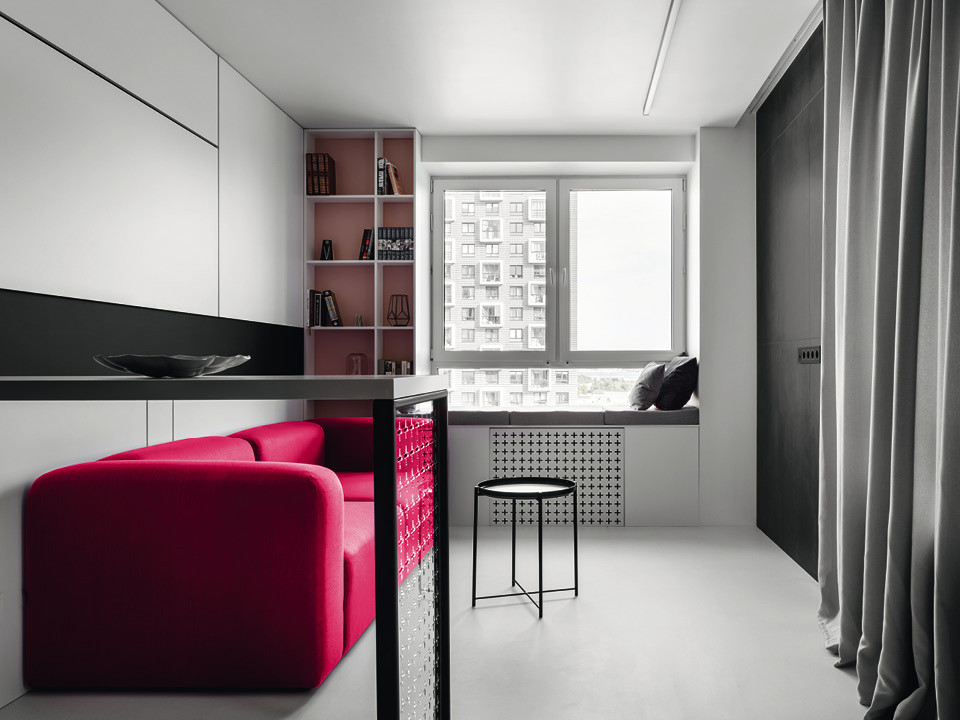 Графичная квартира с яркими вставками цвета стала первым самостоятельным жильем для ее владелицы, молодой девушки, специалиста по международному праву. Поиски дизайнера велись через Instagram (соцсеть признана в РФ экстремистской и запрещена), и на страничке Рустэма Уразметова будущая заказчица увидела тот образ, к которому стремилась: “лаконичность, обилие света и пространства” и любовь к цвету. Немногословная и эффектная квартира стала отражением образа жизни хозяйки, которая часто бывает в командировках, почти не готовит дома и много работает.