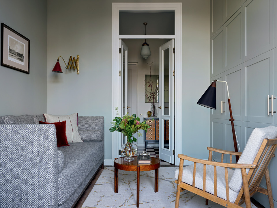Как и в любой маленькой квартире, вопросы хранения стояли в этом проекте остро. “У хозяйки было пожелание сделать невероятное количество шкафов, но это оказалось еще сложнее из-за того, что двухкомнатная квартира превратилась у нас в трехкомнатную”, — говорит Мария. Добрую половину вещей вместила встроенная система хранения в гостиной. Ее филенчатый фасад, похожий на цельную стеновую панель, дизайнер замаскировала с помощью выкраски в тон стенам. За распашными створками, незаметными с первого взгляда, скрываются стеллажи, комоды и телевизор. Шкаф в детской Мария дополнила акцентной нишей с полками, антресолью и рабочим столом.