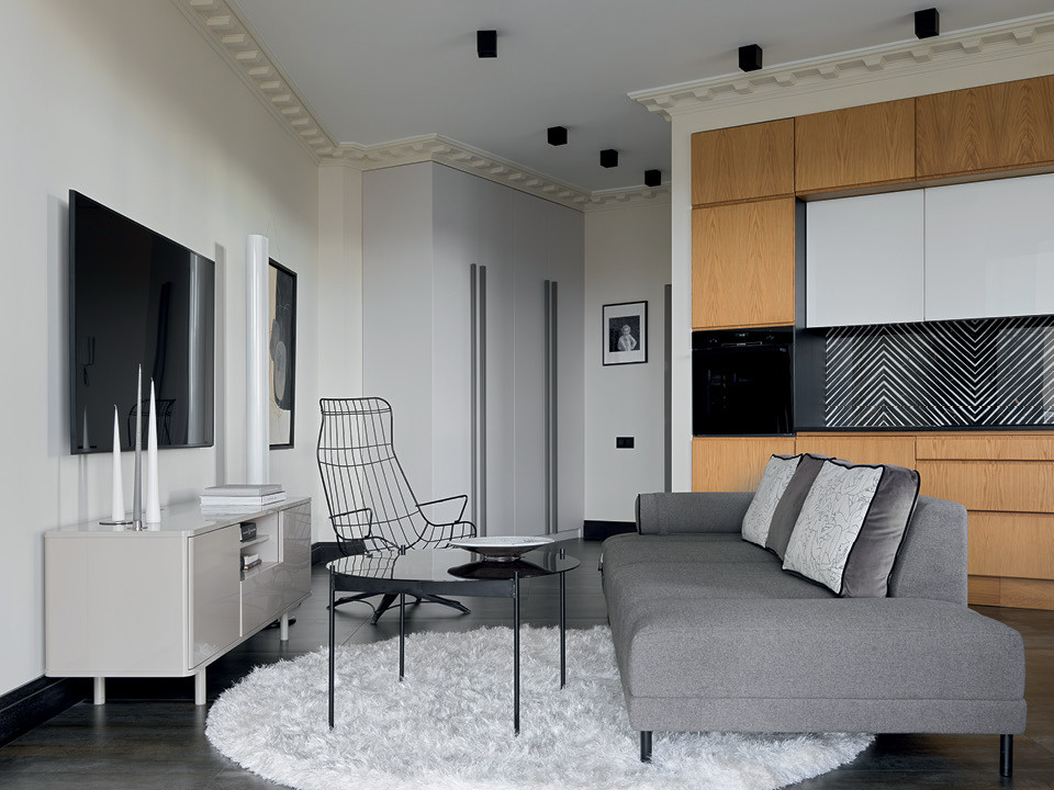 Говорят, что если вы не хотите потерять друга, то не стоит давать ему в долг или работать с ним, но Мария Единая не побоялась спроектировать квартиру для своей подруги. “Я не разделяю это убеждение, и оказалось, что понять пожелания подруги гораздо проще, чем человека, с которым только познакомился. Это был один из самых легких проектов, — рассказывает Мария. — Она попросила сделать бюджетный интерьер с мужским, но при этом чувственным характером в нетипичной для меня монохромной цветовой гамме. Обычно мои проекты более яркие”.