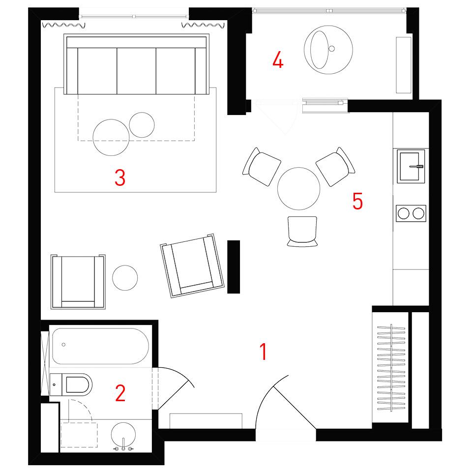 Подруга Сизовой много времени проводит в командировках, а когда возвращается домой, любит приглашать к себе друзей. Так что Катерине надо было подготовить квартиру к серьезному вторжению гостей. На пол положили практичный керамогранит с подогревом — по нему можно ходить, не разуваясь, и не страшно, если кто‑то что‑то разольет. Вместо того чтобы выгораживать место под спальню, сделали полностью открытую планировку и поставили раскладной диван. Это, конечно, не так удобно, как полноценная кровать, но чего не сделаешь ради хорошей компании!