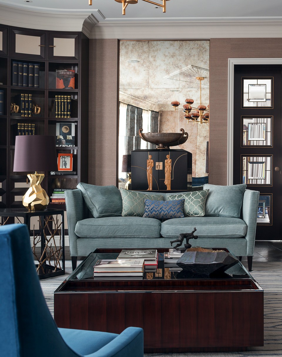 Интерьеры, созданные по проекту бюро Полины Пидцан, выполнены всегда либо в духе американской классики, либо в геометричном и более близком декоратору стиле ар-деко. Гостиная в московской квартире, которая изображена на фотографии выше, — яркий тому пример.“В наше время ар-деко снова становится популярным, — рассказывает декоратор, — современные технологии позволяют нам наделить узнаваемые формы новым функционалом”. Любимые приемы декоратора — использование высоких дверей с латунными вставками, маркетри из разных видов шпона, подбор зеркал, как состаренных, так и современных, сочетание темной мебели и светлых элементов отделки стен и текстиля, а также антикварных предметов 1930‑х годов с мебелью по собственным эскизам.