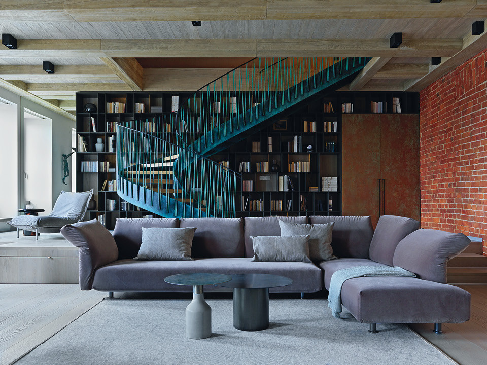 Когда-то здесь была настоящая питерская коммуналка; нынешние владельцы присоединили к ней чердак и поделили на три квартиры. Это одна из них, хозяева делали ее “под себя”. В “МК‑Интерио” они пришли осознанно, увидев проект архитектурной студии в журнале, и попросили сделать что-то похожее. Получился, конечно, совсем другой интерьер, но в фирменном для Махониной и Казаковцевой ключе: лаконичный, с мебелью знаковых брендов и необычными отделками.