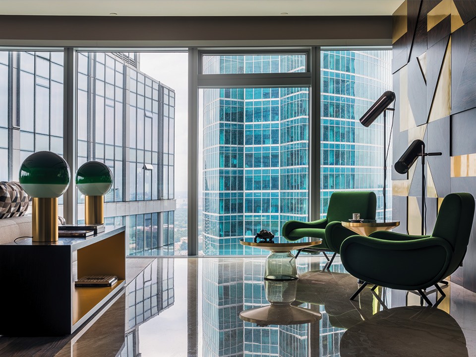 Москва живет не только за огромными окнами этой квартиры, но и внутри нее — отражается в мраморных полах, лаковых фасадах кухни, зеркалах и перегородках, становясь неотделимой частью интерьера.
