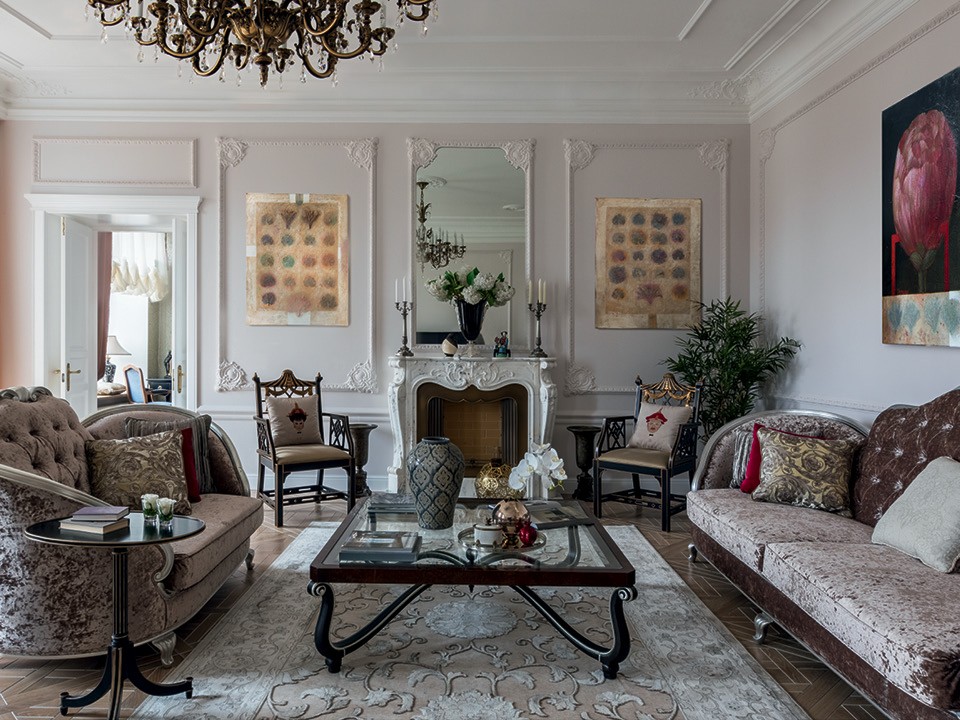 В доходном доме на Петроградской стороне не нашлось квартиры подходящего размера, поэтому были куплены и объединены две соседние, в результате общая площадь получилась 240 м². Примерно половину пространства отдали под общественные зоны — столовую и гостиную. Сама хозяйка называет ее салоном — ей очень хотелось устраивать у себя приемы, как в поэмах Пушкина и романах Толстого, с нарядными гостями и шампанским. Интерьер действительно передает атмосферу старого Петербурга, правда, изначально хозяйка говорила, что хочет барокко, но этой мечте не суждено было сбыться: дом построен в стиле северного модерна, вычурность ему не подходит, и Алла уговорила Юлию на спокойную классику с интересными деталями. Их, как и квартиру, дизайнер и заказчица тоже искали вместе, даже поехали в путешествие по Азии, где в разных уголках нашли и стулья с изображениями китайских императоров, и лаковый черный комод, и буфет-пагоду, и журнальный столик, и картину, написанную на шелке.