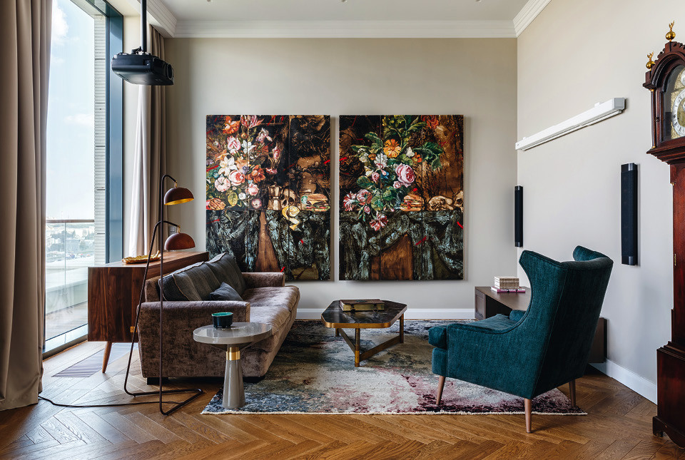 Диптих Ильи Гапонова из серии “Фиатирский престол”, который мы видим в этой комнате, был куплен дизайнером и заказчиками на ярмарке Cosmoscow специально для проекта. “Подбор искусства — сложный и интересный процесс. Картины должны не только подходить по масштабу и колориту, но и отражать мировоззрение владельцев. Это не просто декор на стенах, они наполняют пространство дополнительным смыслом, заряжают его эмоционально, заставляют зрителя думать. Обе картины написаны на деревянных панелях, как иконы. Языком гротеска художник рассказывает о ложных ценностях современного мира”, — говорит дизайнер. Искусство подбирали в уже полностью готовый интерьер. “Для гостиной нужна была крупная и насыщенная по колориту работа, чтобы уравновесить активную сине-зеленую кухню у противоположной стены”, — объясняет Ирина.