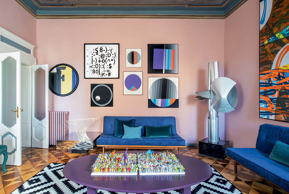 Площадь палаццо, построенного в XVIII веке, — 250 м², и ее занимают парадная лестница, шесть комнат и хозяйский сюит. Новоявленный декоратор и его заказчица с энтузиазмом взялись за дело. На самом деле они работали в шесть рук: Барони также привлек к оформлению интерьерного дизайнера Кристину Селлери, у которой по соседству свой шоурум тканей. Новую жизнь в старые стены вдохнули, перекрасив их или оклеив обоями, постелив на старинный паркет современные ковры, обставив комнаты иконами дизайна середины XX века и добавив повсюду яркий текстиль. “Мы оставили только самые ценные антикварные экземпляры и дополнили их современным искусством и культовыми предметами дизайна. На обновление интерьера ушло всего пять месяцев”, — рассказывает Джорджо.