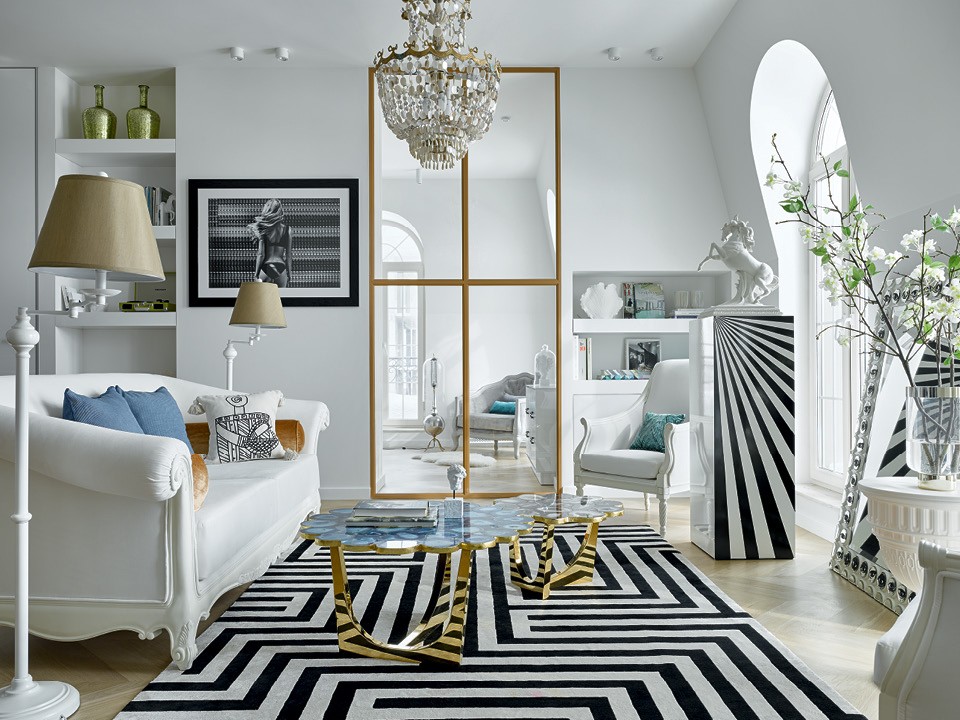 Жилье предназначалось для молодой женщины, которая увлекается современным искусством и со временем планирует собрать собственную коллекцию арт-объектов. “Все пространство должно было стать фоном для будущей экспозиции, и белый цвет подходит для этого идеально”, — комментирует дизайнер. Она понимала, что в целом интерьер получится ярким и эклектичным, и это вторая причина, по которой не стоило перегружать фон. Предметов здесь пока немного, но все они достойны внимания: люстра, собранная вручную из полудрагоценных камней, стул по дизайну Карло Рампацци, расписанный специально для этого интерьера, и зеркало в раме с изображениями глаз. “Когда хозяйка этой квартиры была маленькой, я оформляла ее детскую. Зеркало переехало оттуда, но я его доработала — украсила раму круглыми маленькими зеркалами, на которых нарисованы глаза людей разных национальностей, — объясняет Елена. — Как правило, современное искусство привлекает внимание к какой-то проблеме, и мой посыл заключается в том, что численность населения растет, мы все разные, но мы живем на одной планете”.
