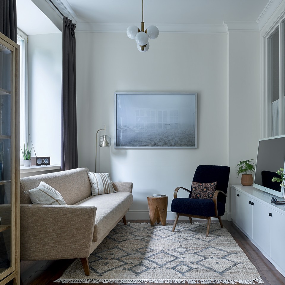Но это квартира не бабушки, а супружеской пары. В основном они живут за городом, но хотели иметь возможность оставаться на ночь в Москве, если задерживались тут по делам. “В шутку они так и называют свою квартиру: “Наш путевой дворец”, — смеется Юлия. Именно поэтому здесь нет множества систем хранения: для кратких визитов они не нужны, два шкафа в прихожей вполне справляются с загрузкой. Зато есть высокие потолки, выходящие в тихий двор окна и правильная геометрия.