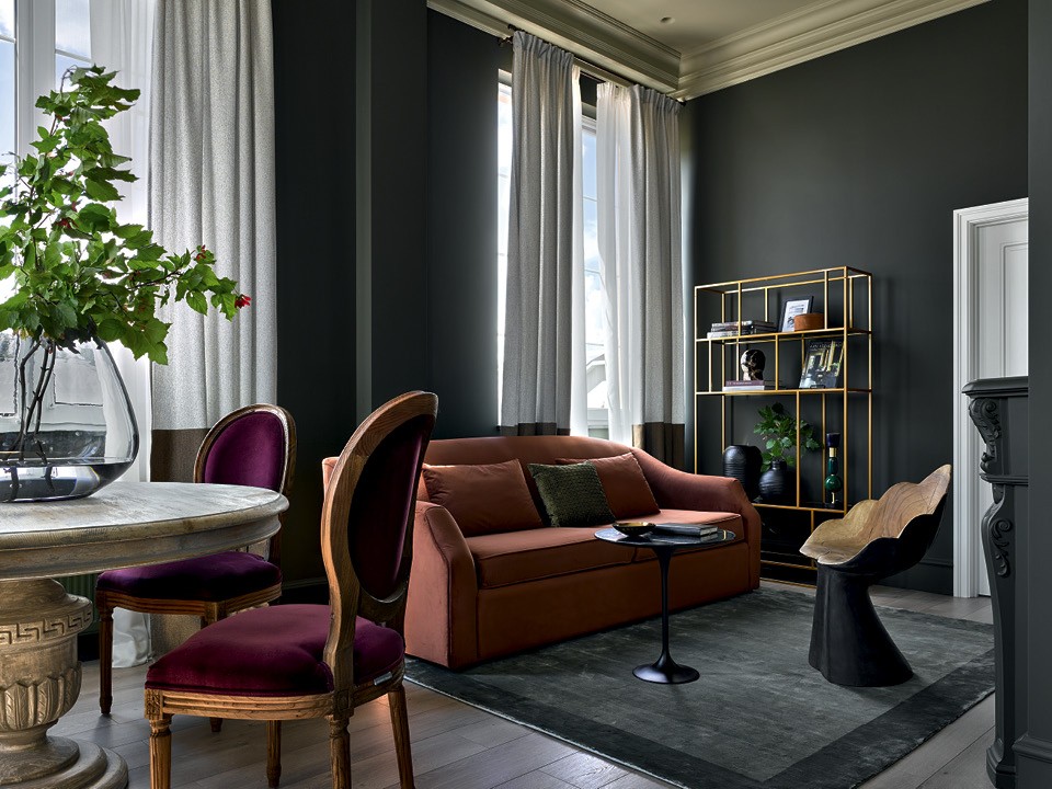 Ариана Ахмад уже оформила основное жилье своей заказчицы, затем квартиру на вырост для ее дочери, эта же квартира в Москве предназначена для бабушки. “Важно было сделать пространство интересным, при этом комфортным для пожилого человека”, — говорит Ариана. Она предложила использовать темный цвет, который эффектно смотрится благодаря высоким потолкам и большому количеству естественного света — в этой квартире целых пять окон. Заказчица хотела, чтобы новая квартира ее мамы была привычной компоновки — объединенное пространство кухни, столовой и гостиной с раскладным диваном, отдельная спальня и выделенная прихожая. В последней есть встроенный шкаф для хранения верхней одежды, обуви и бытовых предметов. Притом что шкаф — внушительного размера и занимает целую стену, он почти незаметен, потому что створки выкрашены в цвет потолочного карниза. Тот же прием архитектор использовала в спальне, где одну из стен отдала под шкаф, который получился еще больше того, что в прихожей. Стена за изголовьем покрашена в темно-зеленый, чтобы придать помещению дополнительную высоту, и карниз сделали того же цвета.