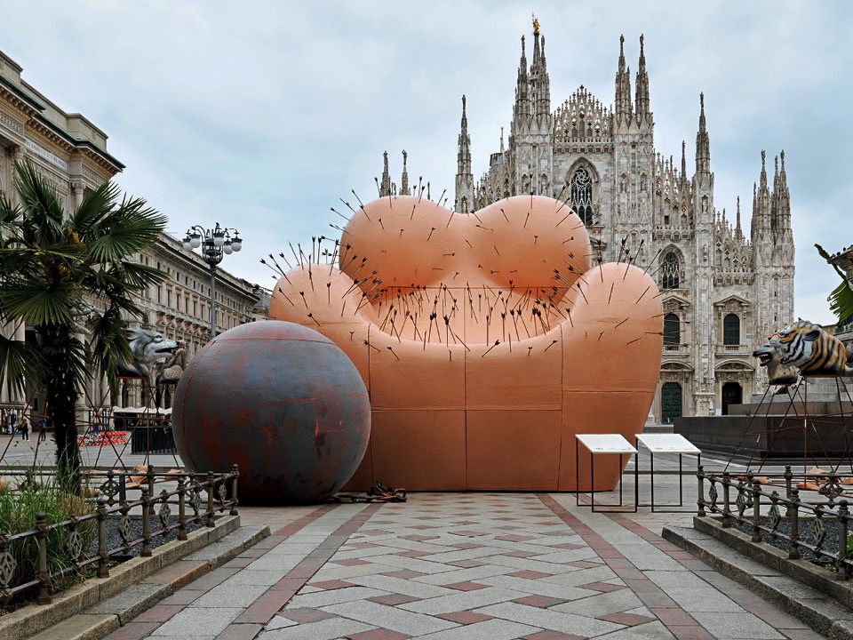 Коллекции Up по дизайну Гаэтано Пеше для B&B Italia в этом году исполнилось 50 лет. Юбилей отметили с размахом — прямо перед миланским кафедральным собором установили гигантскую копию кресла Up 5. Полвека назад оно олицетворяло собой угнетение женщин, и, как считают авторы, эта проблема до сих пор актуальна. Впивающиеся в кресло стрелы и звериные морды по бокам как раз и должны были донести эту мысль до публики.