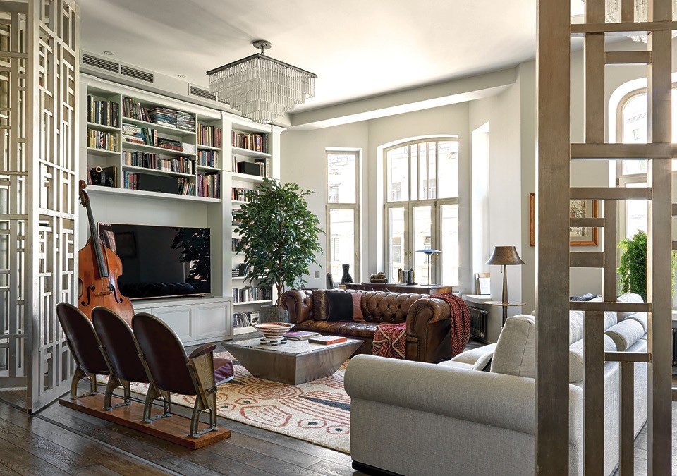 Заказчица хотела перенести частичку парижской атмосферы в свою московскую жизнь: “Только без пышной лепнины, а строго, современно, но с налетом хаоса”. Этим запросом она попала в точку, и дальнейшая работа с дизайнерами шла легко и просто. Элеонора говорит: “Если заказчик делает квартиру не для показа гостям, а для себя и своей семьи, то он обязательно будет вкладывать туда свою душу, поэтому мы были очень рады, что хозяйка полностью погрузилась в работу вместе с нами”. Например, она сама придумала узор для огромной ширмы, разделяющей гостиную и коридор. Несмотря на размер, конструкция цвета шампанского выглядит очень легкой, при этом привлекает внимание. То же самое делают окна, которые в этой квартире разной формы. В офисные времена здесь стояли пластиковые стеклопакеты, дизайнеры заменили их на деревянные с исторической раскладкой и не стали вешать шторы, чтобы не скрывать необычные рамы и вид на старую Москву.