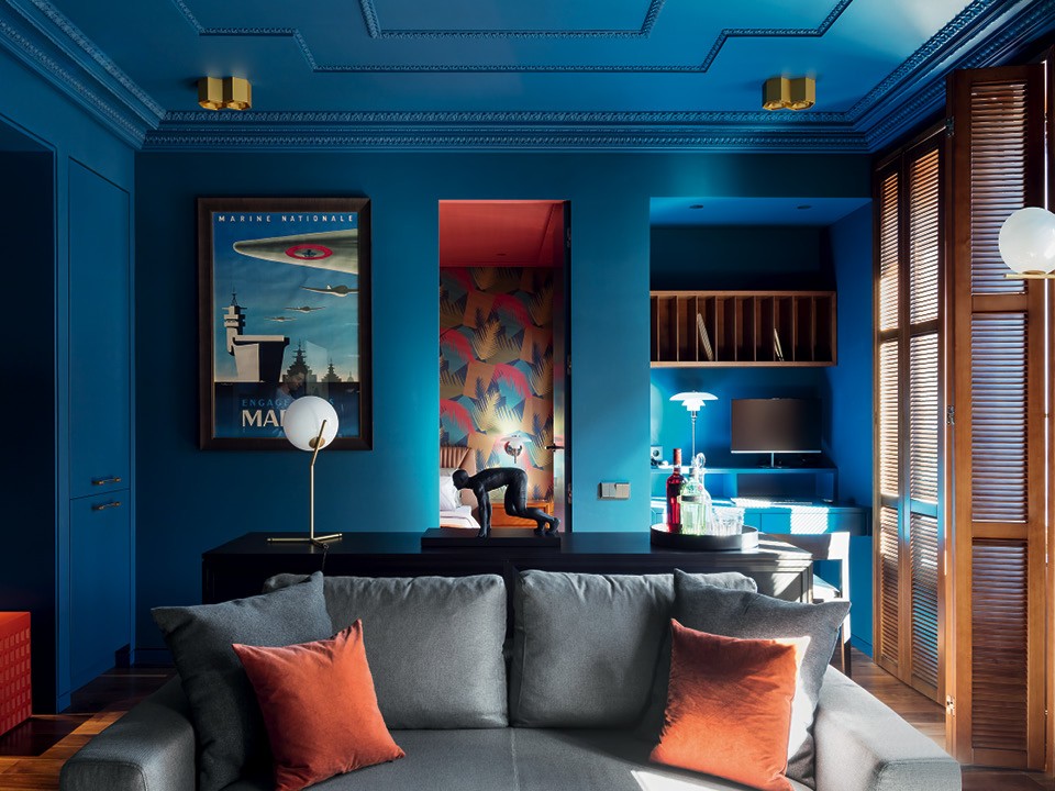 Выбирая квартиру, Петр и Кирилл уже точно знали, какой она должна быть: с отдельными спальней и гостиной, минимальной кухней, отсутствием коридоров, достаточным количеством мест для хранения и обязательно с панорамным видом на Москву. Когда подходящий вариант площадью 55 м² нашелся, архитекторы сделали первую визуализацию интерьера — спокойную, серо-бежевую. А дальше возникла идея использовать синий цвет. “Эта квартира получилась такой, потому что мы делали ее для себя, ведь не каждый заказчик согласится на подобный эксперимент”, — рассказывает Кирилл. Но сперва они опробовали цвет на стене в съемной квартире, чтобы понять, комфортно ли им жить в окружении синего. С момента покупки квартиры, когда дом еще достраивался, архитекторы начали покупать отделочные материалы и мебель. Петр вспоминает: “Когда появилась новая коллекция обоев Cole & Son, мы влюбились в цвет и принт, эти графичные пальмы, сразу купили их, и они лежали в пакете, ждали своего часа”. Именно с обоев был взят лососевый цвет потолка в спальне.