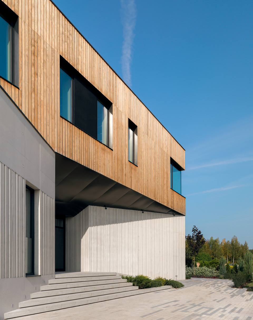 Дом в подмосковном поселке “Миллениум Парк” сперва обращает на себя внимание необычной формой — современная архитектура в наших широтах по‑прежнему встречается не так часто, как хотелось бы. Здание, которое придумала и построила Александра Хелминская-Леонтьева, состоит из двух объемов. Нижний — в форме буквы Г, развернутой навстречу соседней роще и ручейку. В нем, как водится, находится общественная зона плюс спа и бассейн. Второй этаж, который занимают четыре спальни с ванными и гардеробными, проще и напоминает сплющенный кубик, но выделяется обшивкой. Рейки сделаны из дерева Kebony Wood — путем спецобработки оно получает прочность, сопоставимую с тиком. Для большей живописности рейки чередуются с металлическими вставками.