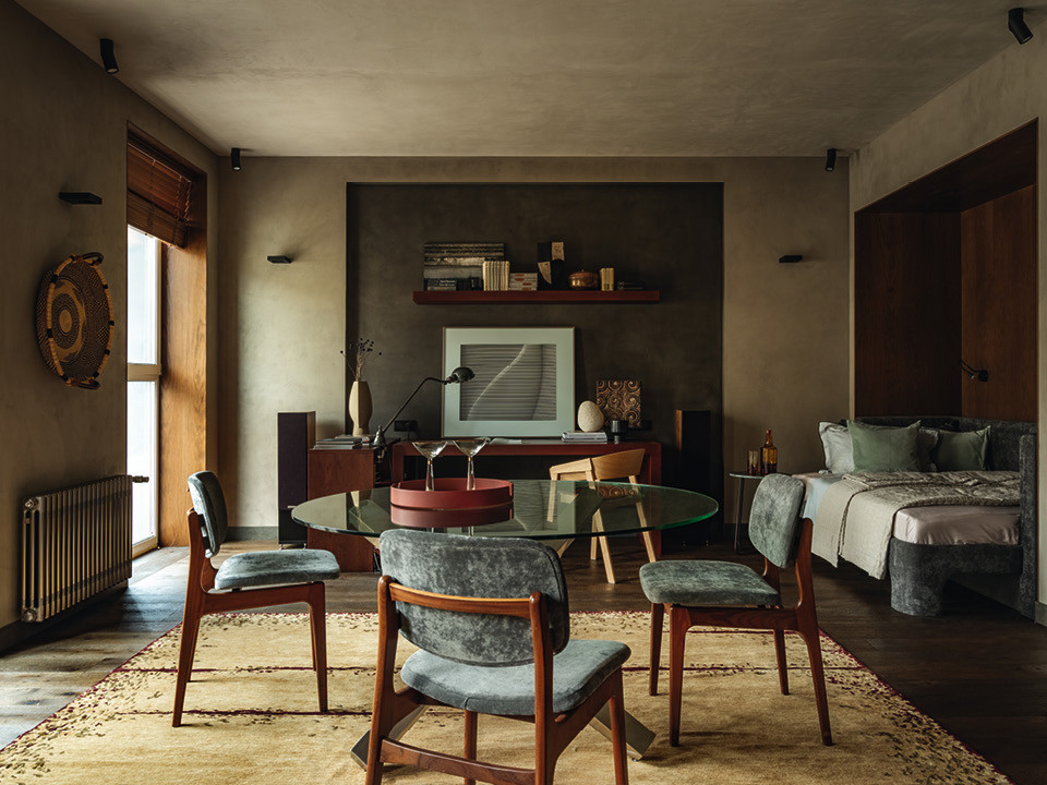 Основное жилое пространство. Винтажные стулья, 1960‑е годы, Дания, из галереи A Table; на столе поднос, Normann Copenhagen; бокалы, “Дом фарфора”