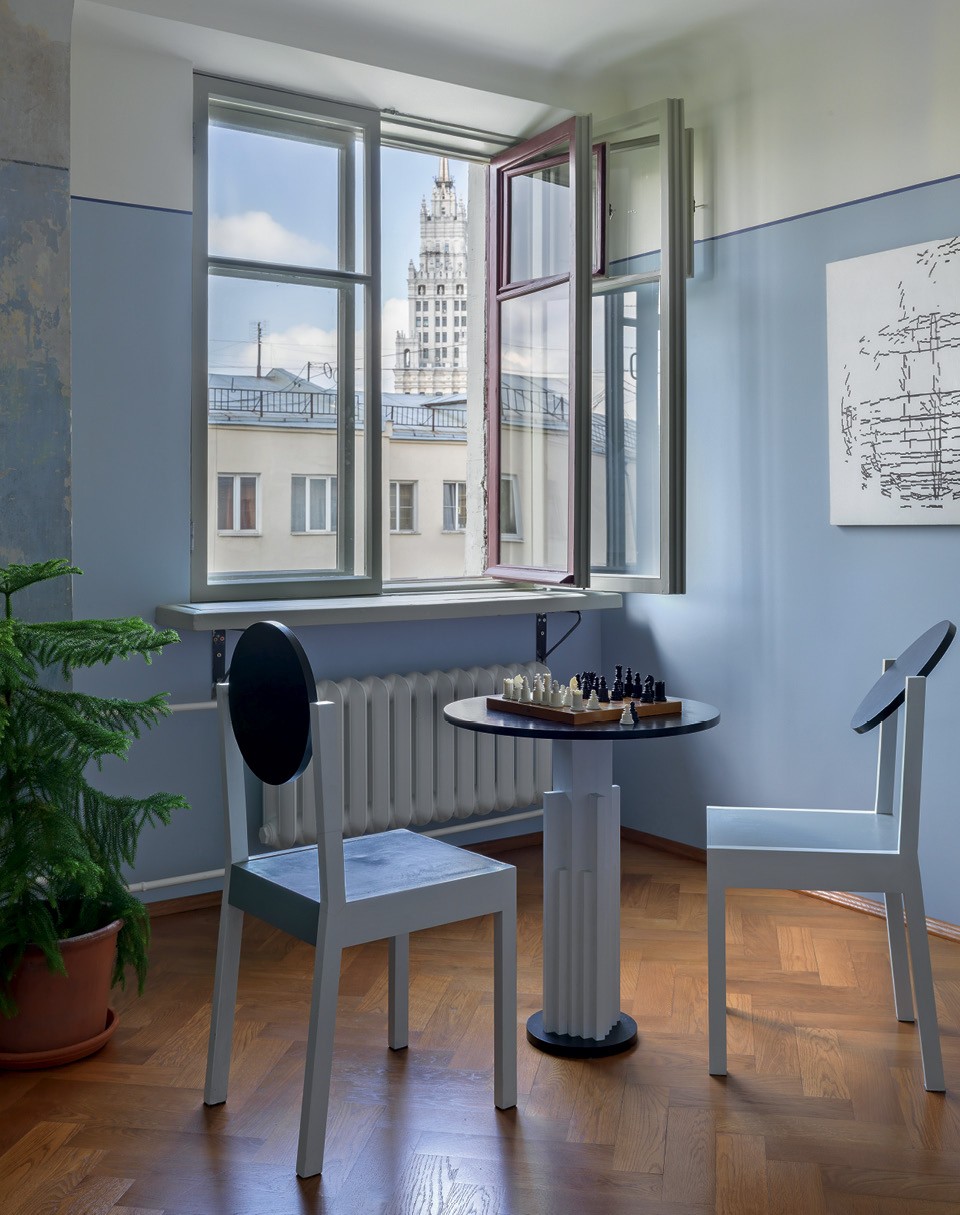“Мы давно присматривались к этому дому. Он построен по проекту Ивана Николаева, больше известного как автор дома-коммуны на улице Орджоникидзе, — говорит Александр. — Нам хотелось найти интерьер, в котором сохранилось как можно больше оригинальных элементов”. Здесь остались старые межкомнатные двери со стеклянными фрамугами, деревянные рамы и пол. Хозяева стремились к достоверности, поэтому планировку оставили без изменений, паркет перебрали (плашки в хорошем состоянии использовали вторично, а остальные воссоздали, сохранив оригинальную раскладку и оттенок), рамы и двери отреставрировали и вернули им изначальный серо-зеленый цвет. Он был обнаружен под слоями краски на одном из окон. Исторический фрагмент законсервировали и оставили на виду. Так же поступили с двумя стенами, где тоже сохранилась оригинальная покраска 1930‑х. “Это была настоящая удача! Авангардисты экспериментировали с цветом, но из того, что было воплощено в жизнь, ничего не сохранилось. Многие думают, что интерьеры советского авангарда белые, но это не так. Теперь мы знаем, как выглядели изнутри конструктивистские дома”, — говорит Александр.