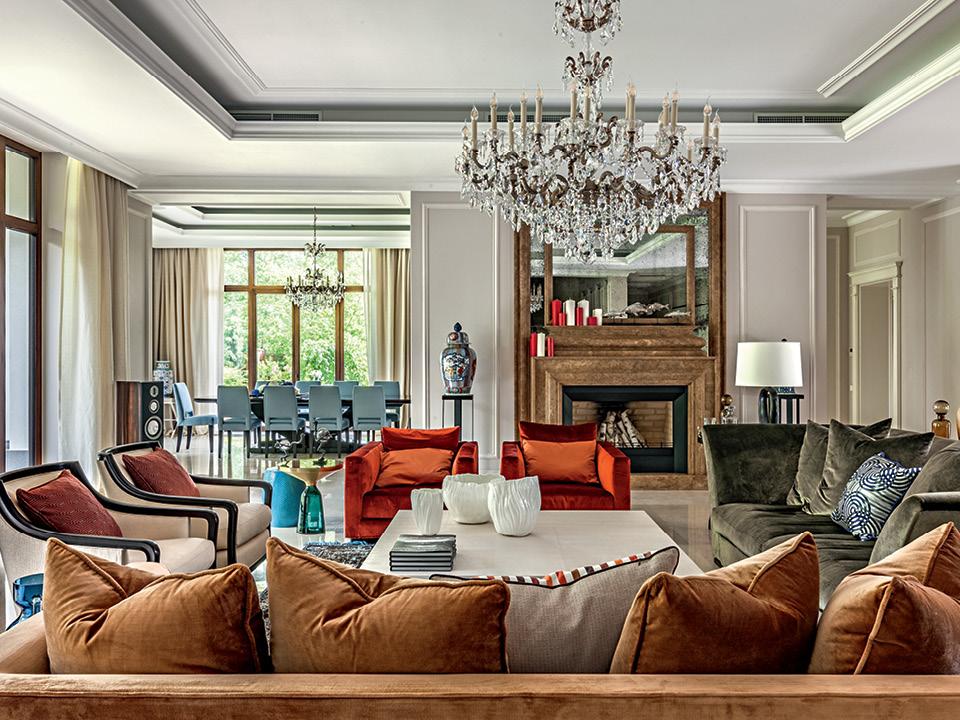 “На участке, который купила заказчица, было две березовые рощи, — рассказывает Анна. — Мы их сохранили: одна оказалась перед домом, вторая — за ним”. Уличная часть проекта и планировка будущего интерьера сильно зависели друг от друга. Хозяйка хотела, чтобы ее дом был просторным и светлым, поэтому во всех помещениях панорамные окна в пол, а ландшафт продуман таким образом, чтобы он смотрелся живописно из любой точки в любое время года. “На одной из лужаек мы высадили растения, которым придали округлую форму: самшиты, невысокие горные сосны и бересклеты, — продолжает Беренштейн. — Эффектнее всего эта поляна выглядит осенью, когда шары меняют свой цвет”. Рядом с террасой, где можно устраивать летние завтраки, растет душистая сирень, а также травы, необходимые для готовки. Есть на участке и огород, но он скрыт за высокими травами и деревьями. А вот в зоне бассейна, наоборот, ничто не отвлекает внимания от картинки за окном. “Обычно шезлонги и прочую мебель ставят у воды, но мы сделали зону отдыха ниже уровня бассейна и разместили в нише яркие диван и журнальные столики. Предметы интерьера не мешают наслаждаться пейзажем за окнами, но в то же время их расцветка разбавляет минималистичность обстановки”, — объясняет Татьяна.