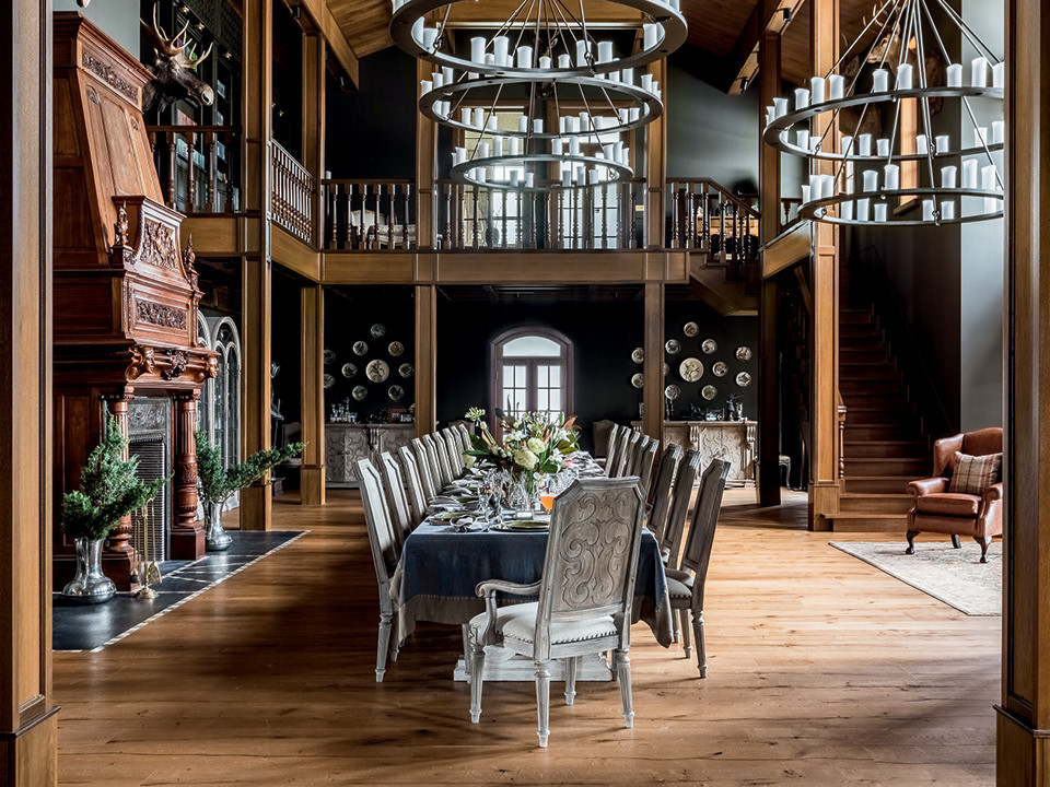 История этого интерьера началась с массивного резного камина и антикварного оружейного шкафа, которые уже были у заказчиков. По ним Курденевич сразу поняла, какую атмосферу необходимо создать в этом доме: старого английского поместья. Мария не только дизайнер, но и актриса, и ей вспомнились строчки из “Рождественских повестей” Чарльза Диккенса, которые можно считать “техзаданием” для этого проекта: “Непогожий зимний день, с ветром, который временами с такой силой обрушивался на старый дом, что тот, казалось, вздрагивал от его порывов. В такой день родной дом кажется родным вдвойне. В такой день уголок у камина кажется особенно уютным. Отблески пламени тогда ярче алеют на лицах людей, собравшихся у огонька, и любой подобный кружок сплачивается в еще более дружный и тесный союз против разъяренных стихий за стенами. В такой ненастный зимний день хочется получше завесить окна, чтобы мрак ночи не заглянул в комнаты; хочется радоваться жизни; хочется музыки, смеха, танцев, света и веселья!” Так в частном охотничьем хозяйстве появился торжественный и уютный “дом-праздник”, как называет его Мария.