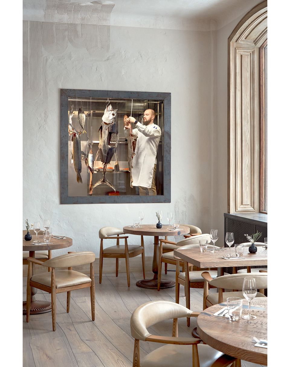 Основательница Studio Caché Татьяна Фокина оформила один из самых известных ресторанов Лондона — Hide, в его интерьеры она добавила множество неочевидных и даже спрятанных деталей. “Когда гость разгадывает или замечает одну деталь, весь интерьер может открыться для него с новой стороны”, — говорит Татьяна. На этот раз ей в работу досталось помещение площадью 220 м² в центре Риги, с высокими потолками и огромным количеством окон. Дизайнер поделила общие зоны на два зала: в первом — две большие барные стойки и шумная атмосфера, во втором — удобные кресла, широкие расстояния между столами, приглушенный свет и один из главных героев ресторана — большой холодильник с окном для вызревания рыбы и мяса.