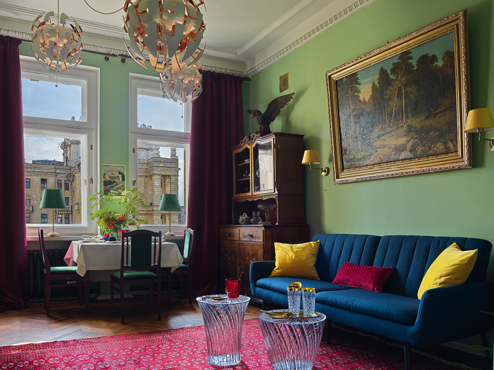 Как обходиться с советским наследием, Алена уже знает, она не первый раз воссоздает атмосферу тех времен. Дизайнер отреставрировала антиквариат, дополнила обстановку европейским винтажем, советской мебелью, найденной на Avito, и репродукциями плакатов, которые покупала на интернет-аукционах. Лепнина, двери, паркет — все осталось “родным”. Цветовую гамму интерьера Сковородникова восстанавливала по первоначальным слоям обоев и краски. В спальне и гостиной она максимально близка к оригинальной, а вот в коридоре оттенок был лососевым и не очень понравился заказчице, поэтому его заменили на более насыщенный бордовый.