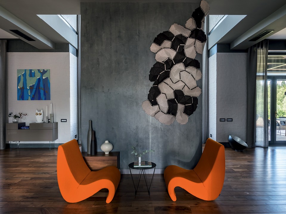 Дом расположен в подмосковном поселке, недалеко от Внуково. Над горизонтом садятся и взлетают самолеты, сам дом стоит на высоком берегу у реки, внизу красивый общий променад, а у участка необычный живописный рельеф. Виды на всю эту романтику раскрываются через большие панорамные окна. Все здания в поселке строились с оглядкой на архитектуру Фрэнка Ллойда Райта, с использованием его коронного приема — взаимосвязи интерьера и природы.