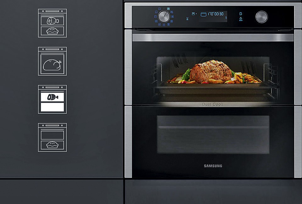 Пространство духового шкафа Dual Cook Flex разделено на две независимые части, с отдельной дверцей для каждой. В нем можно одновременно готовить два блюда в разных режимах, например, запекать мясо и печь пирог. А можно объединить объем духовки, чтобы приготовить крупную птицу.