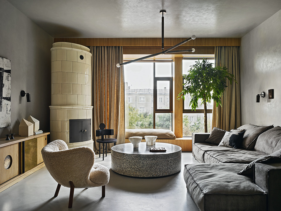 Александра знакома с заказчицей с детства и уже оформила две квартиры для ее семьи, поэтому вкусы друг друга обеим сторонам знакомы очень хорошо. Хозяева квартиры лишь озвучили свои пожелания по помещениям: они хотели большую гостиную, объединенную с кухней, гостевую спальню и ванную, детскую и отдельные личные покои. В предыдущей квартире Александра сделала наливной пол, и заказчикам очень понравился его внешний вид и практичность, поэтому в новом жилье они попросили подобный, и архитектор сделала его из бетона (именно этот материал выглядит отлично даже спустя много лет, на нем не появляются трещины и сколы). Особые пожелания хозяйка высказала насчет кухни: она хотела минималистичную модель, обязательно простую в уходе, без глянцевых поверхностей и стекла, которая бы не слишком выделялась на фоне гостиной и при этом была оснащена по последнему слову техники. Она очень много готовит, и сейчас с удовольствием пользуется духовкой с камнем для пиццы, большим холодильником с ледогенератором и индукционной варочной панелью, которая без стыков встроена в керамическую столешницу. Но все же главная героиня этого пространства не кухня, а печка, сделанная на манер “голландок”: роль очага играет биокамин. Овальную в срезе конструкцию Александра придумала сама, и оказалось, что изразцы для печи такой формы нужно делать на заказ (у них сложный изгиб, и готовых в продаже не существует). Но такие задачи для архитектора не в новинку — она очень любит проектировать мебель сама и делает это п