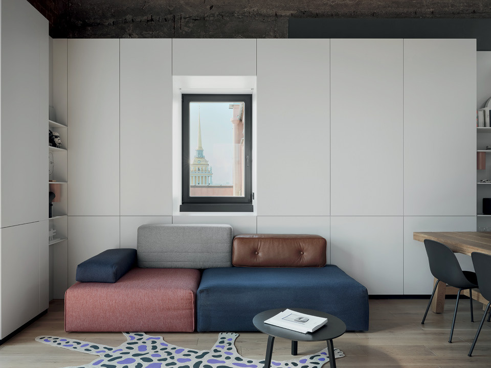 Квартира по площади небольшая, но обязанностей на нее возлагалось много: это и пространство для жизни, и место для встречи с друзьями. Чтобы не загромождать его и оставить визуально чистым, Борис и Анна закрыли все по периметру панелями МДФ. Они скрывают места для хранения, инженерные системы и даже радиаторы и напольные конвекторы, которые встроены в пороги перед выходом на террасу и балкон. Только на монтаж шкафов ушло три месяца: дом старый, все поверхности кривые, прямых углов нет, поэтому мастера сначала все монтировали на месте, подрезали или наращивали там, где это было необходимо, а потом разбирали, увозили на покраску и снова возвращали в квартиру. Таким образом архитекторам удалось получить идеальные стыки.