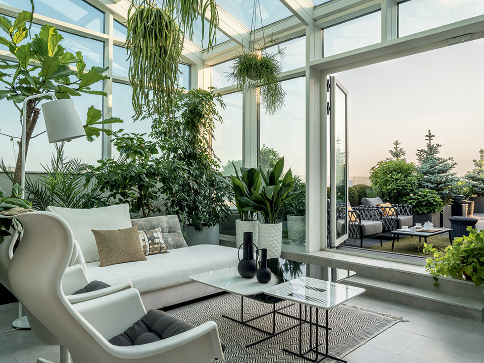 Екатерина Бегичева и ее семья обосновались в пентхаусе с просторной террасой, которую дизайнер превратила в сад, высадив на ней крупные деревья и кустарники в кадках.