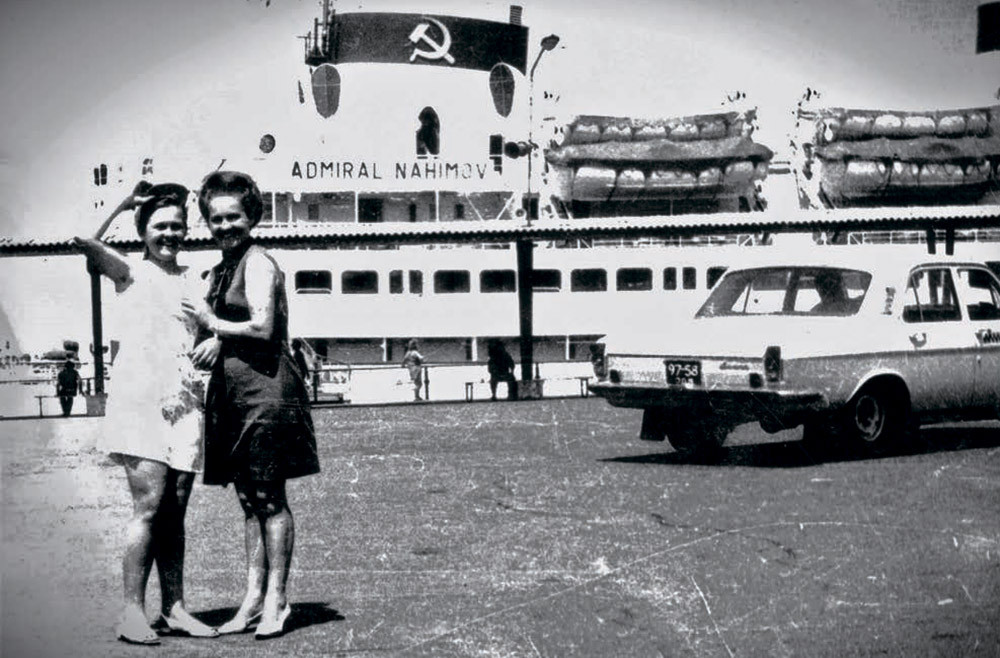 Пароход «Адмирал Нахимов», труба которого видна на заднем плане фотографии, был «иномаркой» не по внешнему виду, а по сути. Построен он был на верфи в Бремене в 1925 году. В тридцатые годы «Берлин», так называлось судно, использовался как круизный лайнер, а в годы Второй мировой войны – в качестве плавучего госпиталя. С 1949 по 1957 год пароход, дважды подрывавшийся на минах, проходил восстановительный ремонт сначала в доках Кронштадта, а потом на верфях ГДР. В восстановленном виде и с именем «Адмирал Нахимов» судно поступило на службу в Черноморское морское пароходство. В течение 29 лет «Адмирал Нахимов» совершал круизные рейсы на Крымско-Кавказской линии.