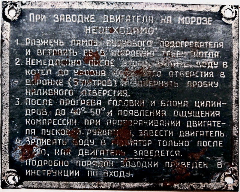 На отечественных грузовых машинах могло быть с десяток подобных табличек. Они объясняли, как пользоваться раздаточной коробкой, лебедкой, системой подкачки шин, масляным радиатором или – наш случай – пусковым подогревателем.