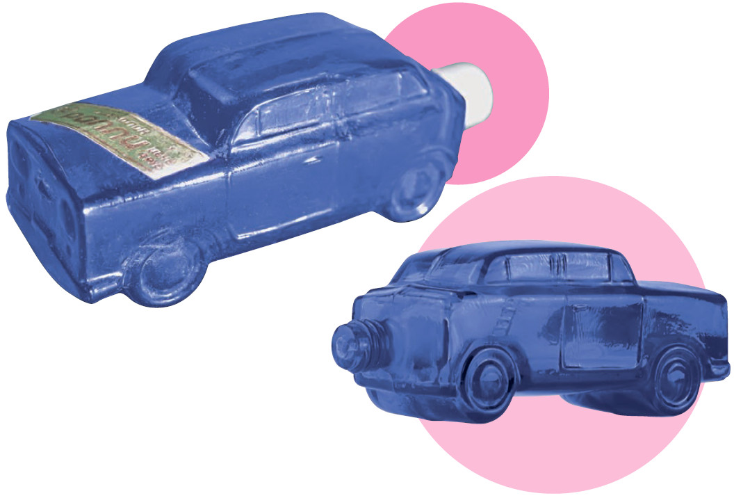 Принято считать, что автомобиль только отравляет воздух своими выхлопными газами, но это не тот случай – стеклянный флакон должен был производить только приятный аромат. Такой одеколон под названием «Ралли» в советское время выпускала московская парфюмерная фабрика «Новая заря». Когда именно он появился, неизвестно, но на интернет-аукционах «Авито» и «Мешок» можно найти несколько вариантов исполнения: из прозрачного стекла и немного другой формы, очевидно, ранний вариант, а еще из зеленого бутылочного или кобальтового стекла – точно такой же, как на фото. Все флаконы продаются уже пустыми, поэтому ощутить запах «Ралли» не представляется возможным, разве что ктонибудь десятилетиями хранил одеколон нераспечатанным. Какой именно автомобиль послужил прототипом для флакона, уже и не скажешь. Скорее всего, это собирательный образ, созданный художником, что называется, «по мотивам». Можно только понять, что это купе – по одной двери с каждой стороны. Иногда флаконы продаются с этикеткой – полоской бумаги, которую наискосок наклеивали на капот. С годами дизайн этикетки немного менялся, но цена всегда оставалась прежней – 4 рубля. К слову, это немногим дороже бутылки водки, стоившей 3 рубля 62 копейки. После такого сравнения вспоминаются незабвенные строки «Ален Делон не пьет одеколон», но в песне подразумевался не «Ралли», а «Тройной одеколон», столь любимый советскими алкоголиками за крепость в 64 градуса и «народную» цену 40 копеек. Использовался ли одеколон «Ралли» в качестве «фун