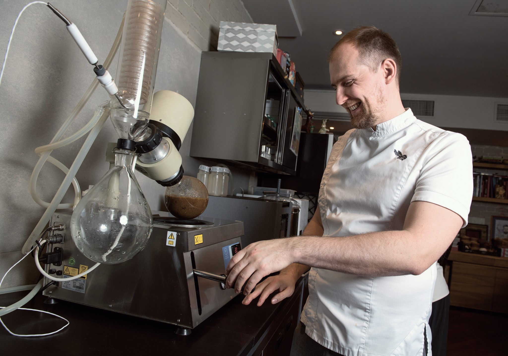 С помощью ротаваля мы дистиллируем разные вещества, обычно распадающиеся при нагревании. Благодаря низкой температуре кипения жидкости в вакууме аромат в дистилляте получается более естественным, концентрированным. Аппарат позволяет экстрагировать эфирные масла, делать дистилляты из самых неожиданных ингредиентов. Однажды на Хэллоуин мы сделали дистиллят из самой обычной осины — он дал какой-то невероятный аромат фруктов, конфет — и предложили гостям десерт «Осиновый кол».