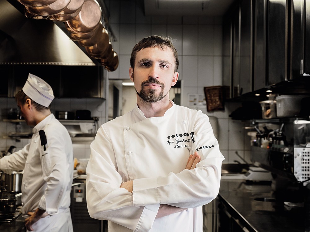 Во-первых, «Сапсаном» от московского офиса до Невского быстрее, чем по репетирующей парады Москве с одной соседней улицы на другую. Во-вторых, не успеешь написать, например, о Selection, как Айк Вейшторт, на пару месяцев сделавший это странноватое место обязательным к посещению и обсуждению, уже уехал работать в Ереван. (Хотя бы не в Санкт-Петербург.) А вот Игорь Гришечкин семь лет кряду с неизменным энтузиазмом творит на кухне «Кококо» и странности, и интересности, и кашу из топора, и — как бы пафосно ни звучало — историю. Говорит, что у него все сложилось абсолютно незапланированно.