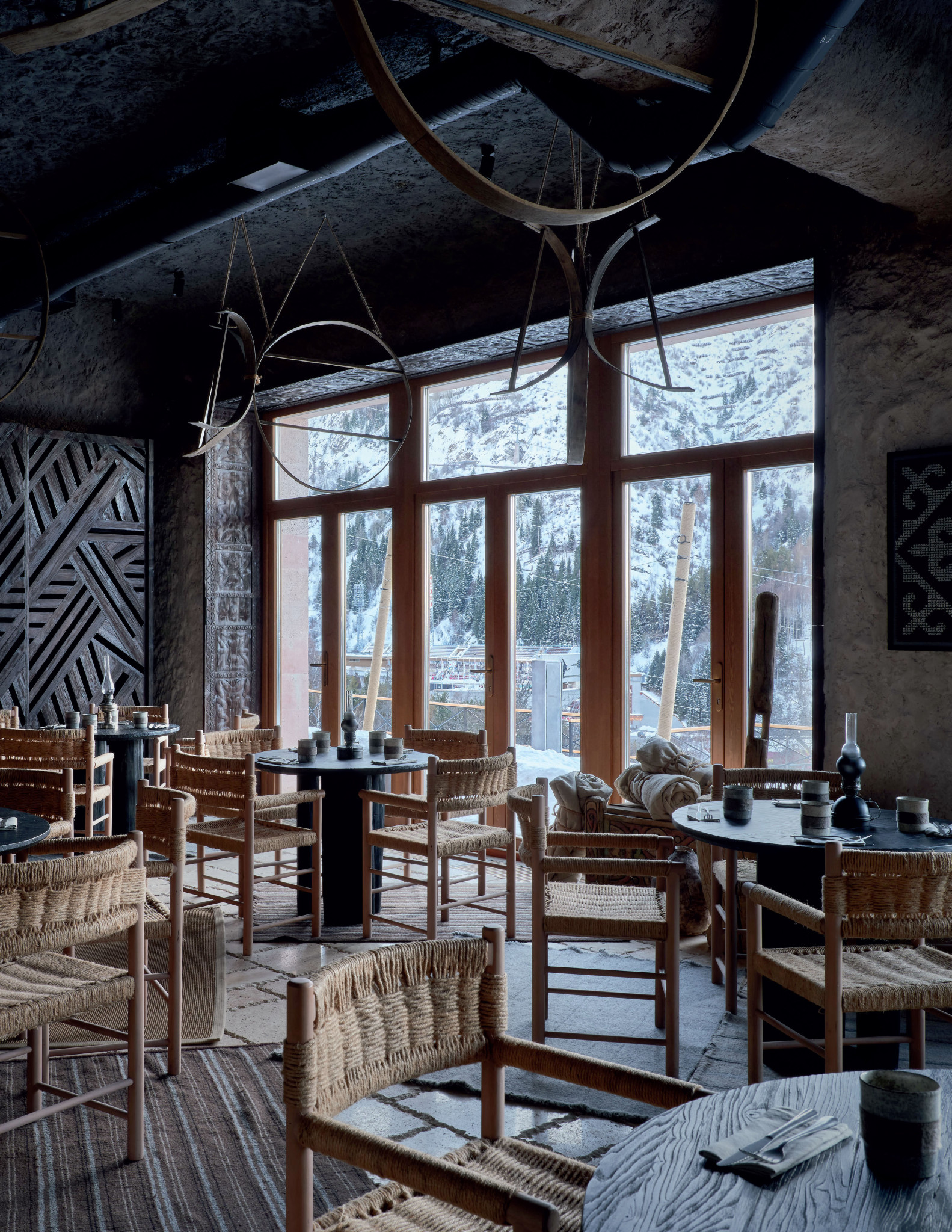 Задумали открытую планировку ресторана, чтобы посетители могли видеть весь процесс приготовления пищи. В разных точках пространства, будь то зона топчанов, бар или места с классической посадкой, можно увидеть все, что происходит на кухне — главной сцене ресторана. Форма куполов над зоной приготовления перекликается с формой чаши — важной архитектурной формой кочевников — и визуально отделяет гостевую зону.
