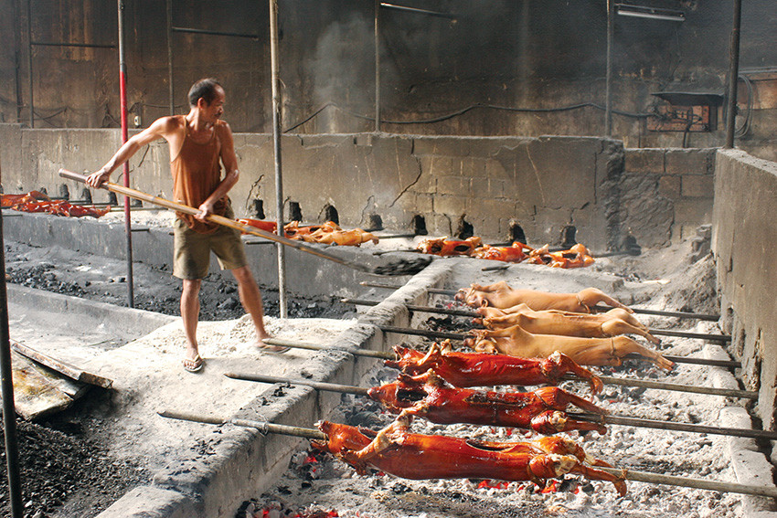 С бойни непрерывно подвозят подготовленные к жарке тушки весом до 15 кг и длиной до метра. Их хорошенько натирают изнутри ядреной смесью молотого перца, чеснока и крупной морской соли. Затем фиксируют на деревянных вертелах толщиной с руку и укладывают в ряд над раскаленными углями. Циклопических размеров мангал может принять десяток-полтора таких тушек. Остроумный механизм с цепями и шестеренками медленно проворачивает все вертела одновременно. За процессом постоянно наблюдает специально обученный человек с типичной внешностью кочегара. Банальной совковой лопатой он по мере надобности ворошит и подбрасывает уголь.