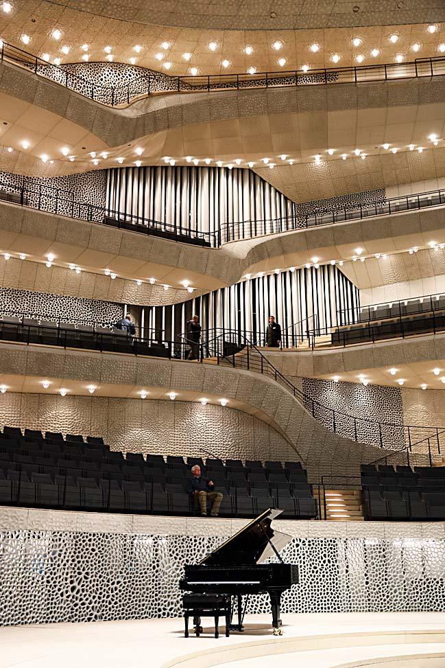 Проект назвали «Филармония на Эльбе» (Elbphilarmonie Music Hall). Он получился дорогим. Когда в 2006-м город заключил контракт со швейцарскими архитекторами Жаком Херцогом и Пьером де Мероном, предполагалось, что объект обойдется Гамбургу в €180 млн и будет готов в 2009 году. В итоге открытие состоится только 11 января 2017 года, а финальная стоимость проекта достигла почти €780 млн. Над прочной основой из старого красного кирпича возвышается прозрачная, стеклянная, с изогнутыми окнами и будто продуваемая ветрами конструкция. Общая высота здания превышает 110 м. В центре большой концертный зал на 2100 мест и еще один — на 500. Восточную часть занимает отель на 244 номера, а западную — 45 апартаментов, где любители музыки могут поселиться и любоваться видами из окон на гавань и город. Подходя к центральному входу, посетитель попадает в длинный туннель с эскалатором длиной 82 м, который доставляет его на крышу бывшего склада — теперь это смотровая площадка на высоте 37 м, откуда открывается прекрасный вид.