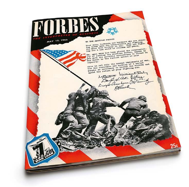 Гитлер мертв, Муссолини тоже, Европа неделю назад отпраздновала победу. Но одна из стран Оси продолжает сражаться — это Япония. Чтобы продолжать борьбу, Америка прибегла к уже испытанному средству — военным облигациям. Forbes внес свой вклад: обложка номера от 15 мая полностью отдана под бесплатную рекламу 7-го военного займа. И это уже не первая такая акция, в 1940-е журнал как минимум трижды бесплатно рекламировал военные бонды. За $18,75 инвесторы могли купить бумагу номиналом $25 с обязательством государства выплатить разницу через 10 лет (в нынешних ценах это соответственно $250 и $330). Всего США получили за военные облигации $156 млрд (равно нынешним $2,1 трлн).
