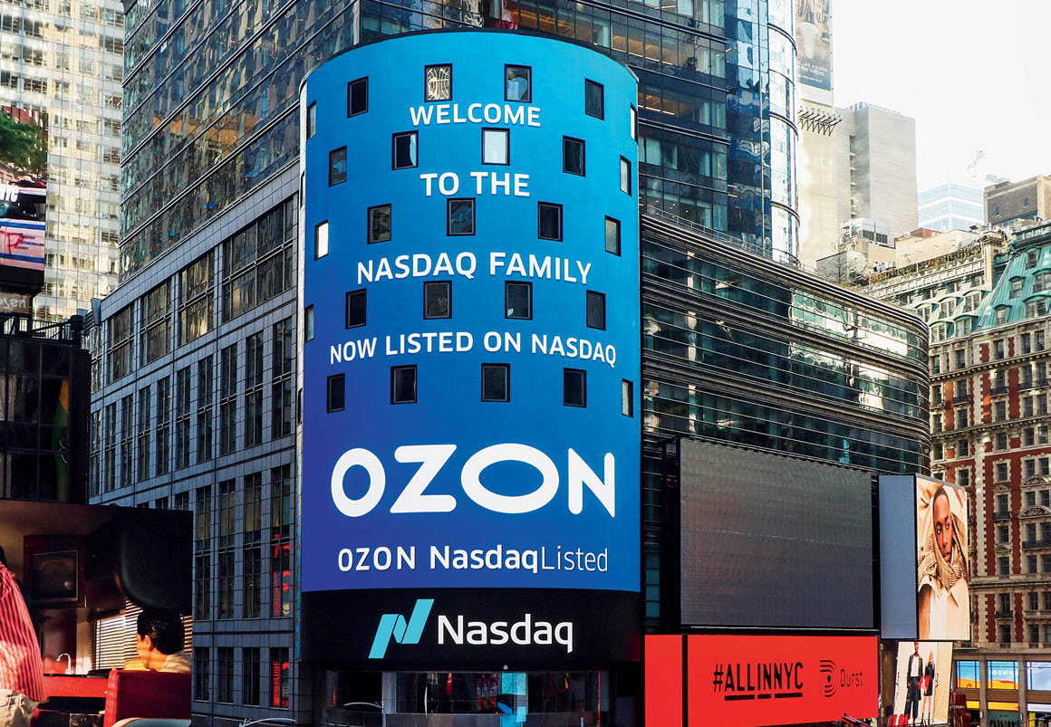 Торжества по случаю начала торгов бумагами Ozon прошли, как и полагается в коронавирусном 2020 году, большей частью виртуально. В Нью-Йорке церемонию транслировали на Таймс-сквер. На Московской бирже мероприятие прошло офлайн, но в узком кругу. На небольшой сцене на расстоянии друг от друга стояли пять человек: топ-менеджеры биржи, Ozon и его крупнейших акционеров — АФК «Система» и Baring Vostok. Все это транслировалось онлайн. Сами торги начались днем ранее. Акции компании в первые часы подскочили в цене на 30–40% на обеих площадках. Только за вечер 24 ноября на Московской бирже объем торгов бумагами Ozon превысил 10 млрд рублей. В ходе IPO Ozon привлек $990 млн, продав акции по $30 за штуку. Инвесторы оценили компанию в $6,2 млрд (с учетом всех конвертируемых займов и опционов). Книга заявок была переподписана более чем в 10 раз.