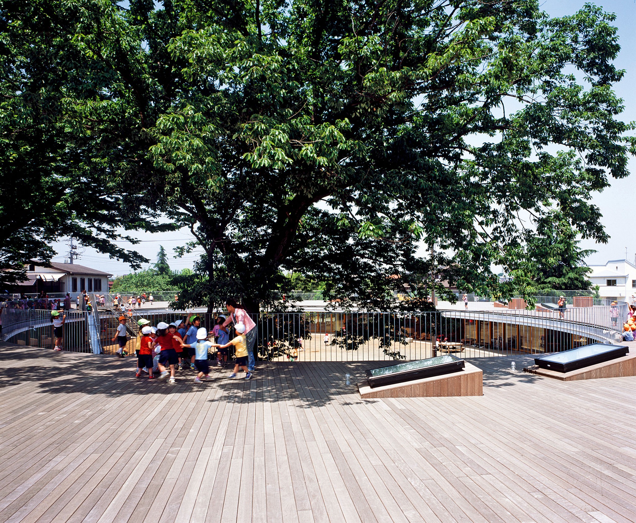 Возможность выбраться на крышу — высотного дома или бабушкиной дачи — в детстве кажется очень заманчивой. Дети карабкаются на крыши веранд на прогулочных площадках, всегда стараются быть повыше. С 2007 года в пригороде Токио работает детский сад Fuji, в котором крыша — важная часть игрового пространства. Детский сад построен в форме кольца окружностью 200 м, площадь здания 1400 кв. м, но оно вмещает 19 групп (620 детей). Внутри кольца — игровая площадка. В пространстве садика дети перемещаются не только по горизонтали, но и по вертикали. Попасть на крышу можно разными способами, например подняться по лестнице или по дереву. Несколько высоких деревьев, которые росли здесь раньше, встроены в конструкцию, ребята могут тренировать силы, взбираясь по ним на крышу и спускаясь вниз. Есть еще вариант спуска — скатиться с пологой горки.