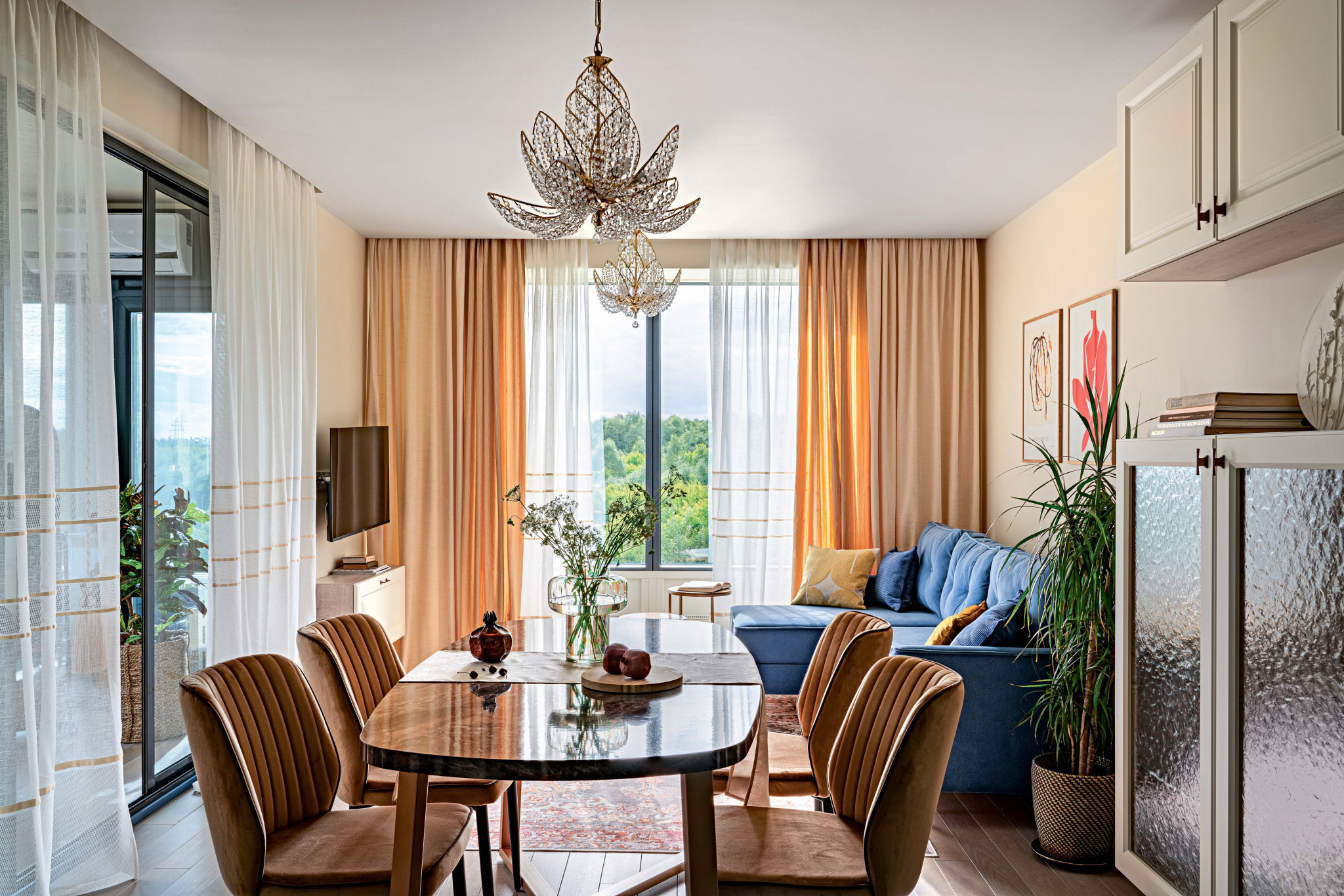 Архитектура современного жилого комплекса в центре Казани стала точкой отсчёта в оформлении этой квартиры: выразительные фасады с панорамным остеклением требовали ответа в интерьере, а вид на парк и на реку подсказывал тему природы. В итоге получилось комфортное пространство со спокойной, расслабляющей атмосферой, актуальный микс современности и классики с природными мотивами.