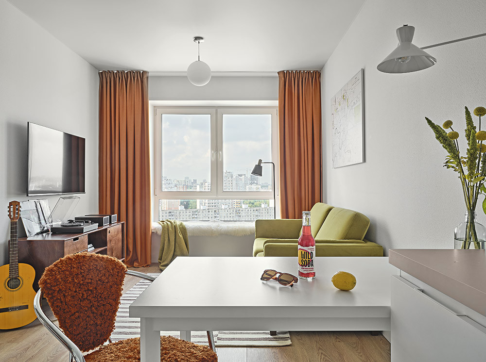 Маленькую квартиру в новостройке дизайнер сумела превратить в колоритное пространство для увлечённого и компанейского парня. Для этого ей понадобилось выведать у родителей буквально всё об интересах и привычках их сына, представить себе образ молодого человека и создать для него благоприятную среду, импровизируя цветами, формами и фактурами на фоне имеющейся типовой отделки.