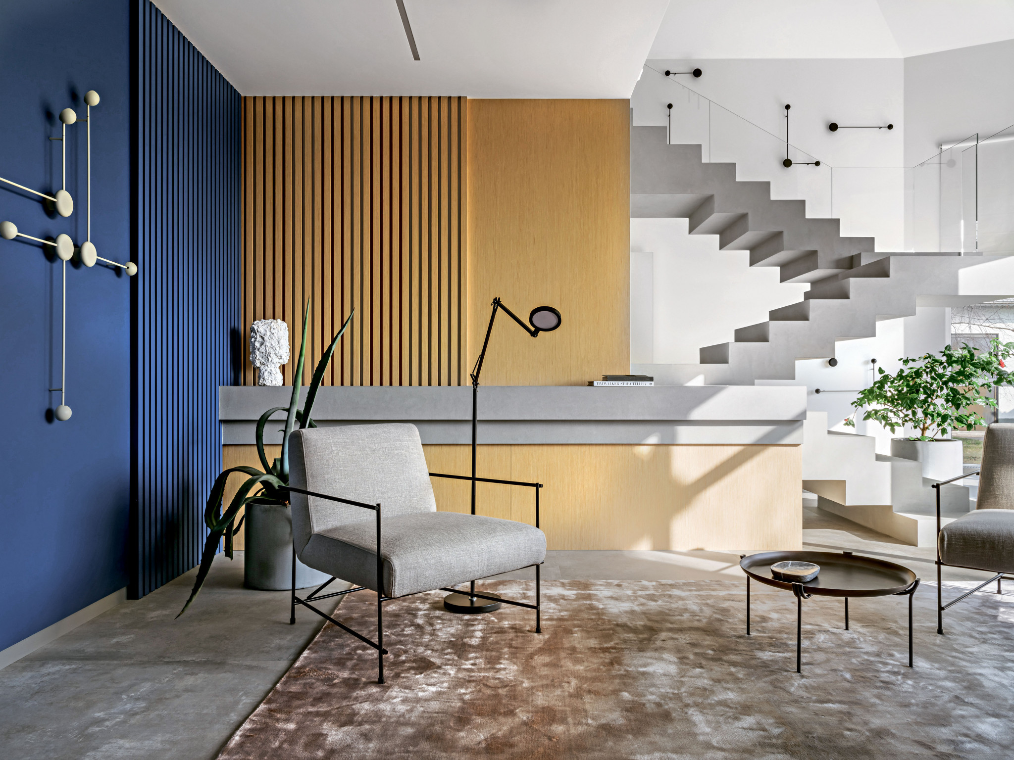 Интерьер создавался для взрослой семейной пары. Хозяева много времени проводят дома, любят принимать гостей и родных, часто путешествуют, ценят комфорт и уединение. Заказчица нередко работает из дома. Детские освободились. Планировка стала неактуальной для нового образа жизни, и необходимо было пересмотреть интерьер не только стилистически, но и конструктивно. Основной вопрос вызывала лестница — достаточно громоздкая, с массивными монолитными перилами. Заказчики же хотели лёгкую, парящую конструкцию, которая являлась бы украшением интерьера.