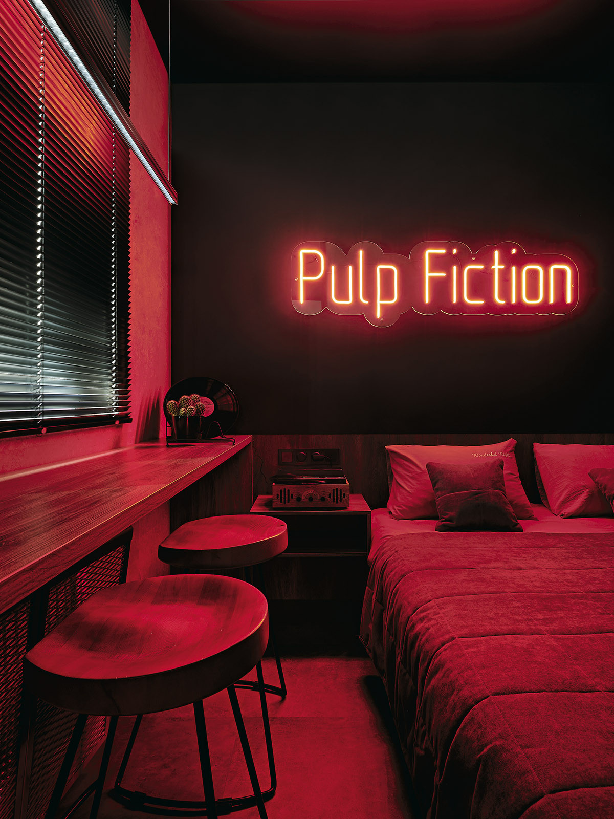 «Криминальное чтиво» — один из культовых фильмов ХХ в. и, как оказалось, отличная идея для интерьера небольшой студии, предназначенной для сдачи в аренду. Дизайнер нашла удачный баланс между художественными и функциональными решениями, что особенно важно в маленьком пространстве