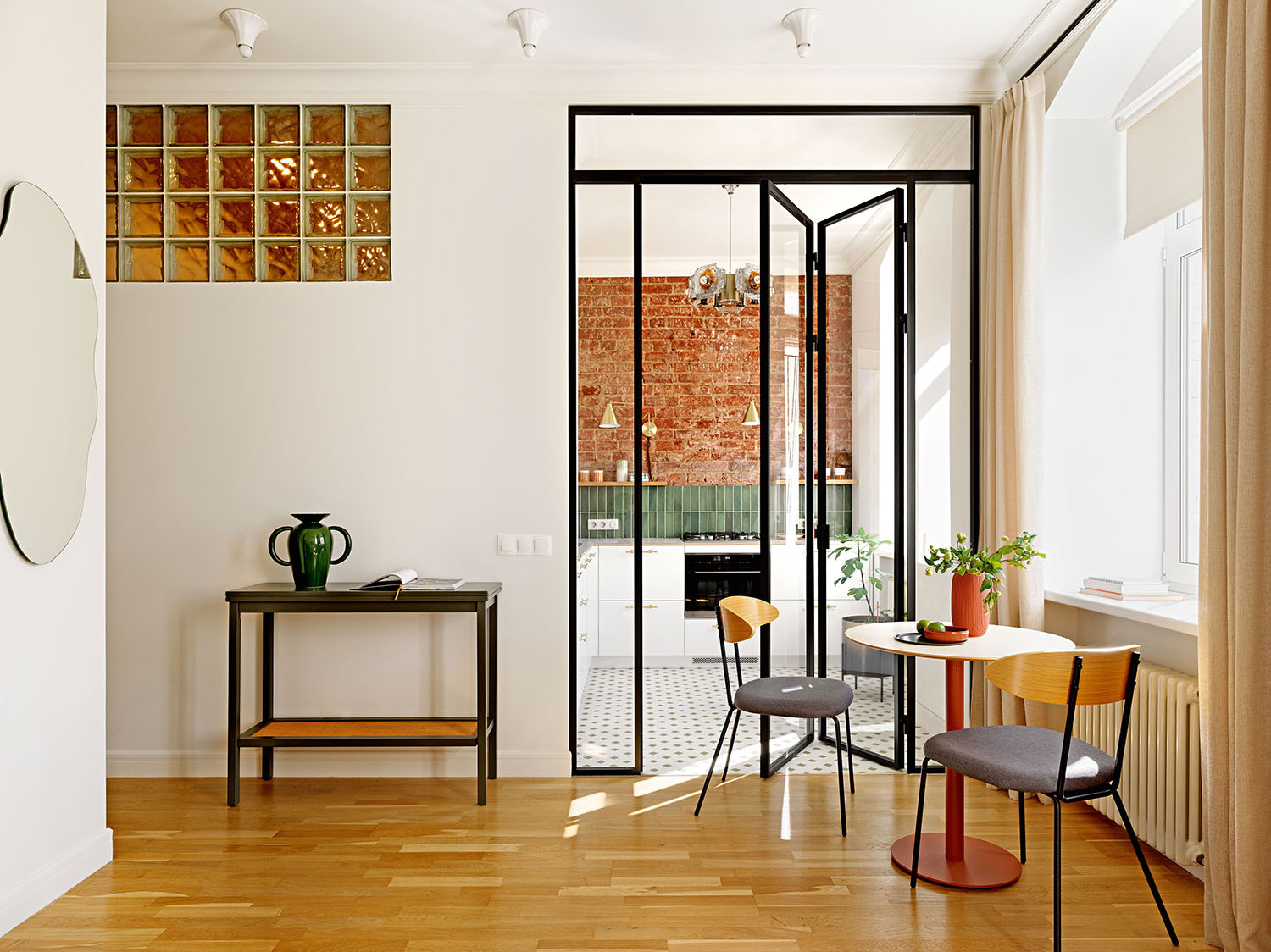 Планировка. Она осталась первоначальная, добавили только лёгкую и графичную стеклянную перегородку между кухней и гостиной, а также шкаф между зоной спальни и коридором. Всё пространство квартиры — открытое, поделенное на зоны. При входе направо — гардеробная, налево — санузел. За стеной санузла находится кухня, от входа она не видна. Также скрыта и зона спальни. Вид от прихожей — на залитую естественным светом зону гостиной-столовой: элегантные арочные окна, уютный диванчик с журнальным столиком, низкий шкаф и небольшой круглый стол для завтраков.
